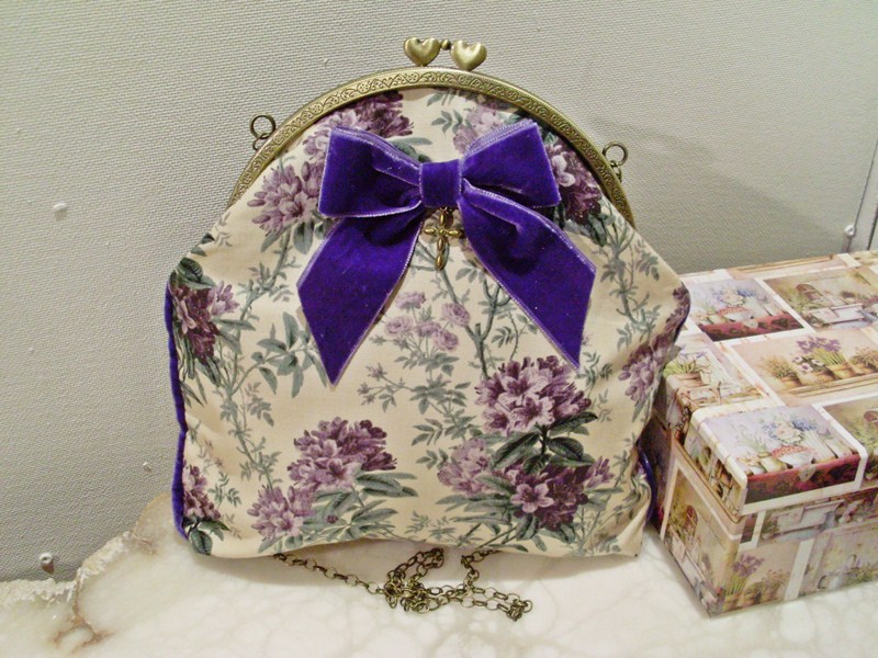 Este bolso esta realizado a mano en su totalidad. Tiene dos posiciones con dos broches intercambiables, uno de ellos es un lazo del que cuelga una cruz en el centro del mismo y el otro broche es redondo con un lacito de metal colgando en el centro.